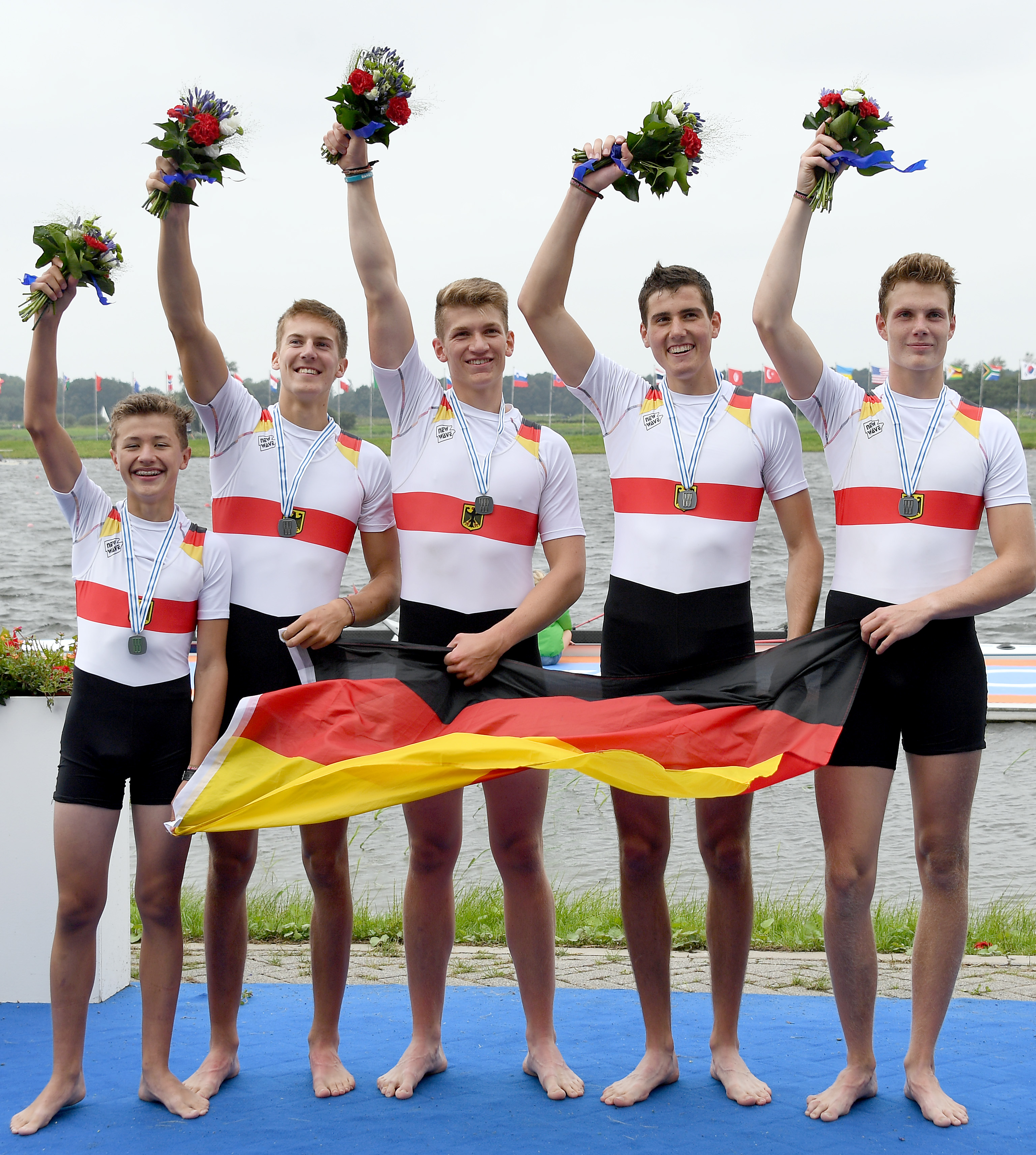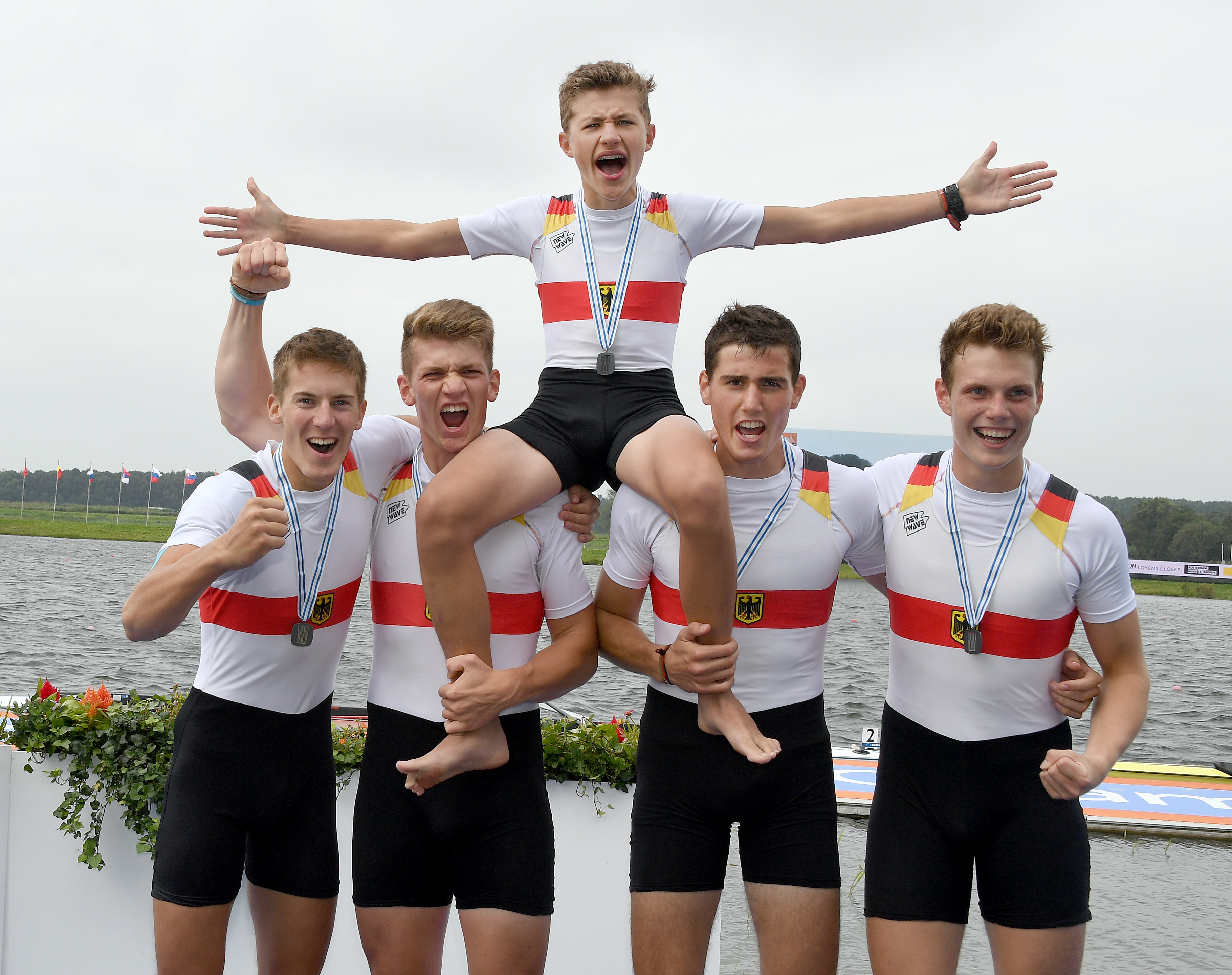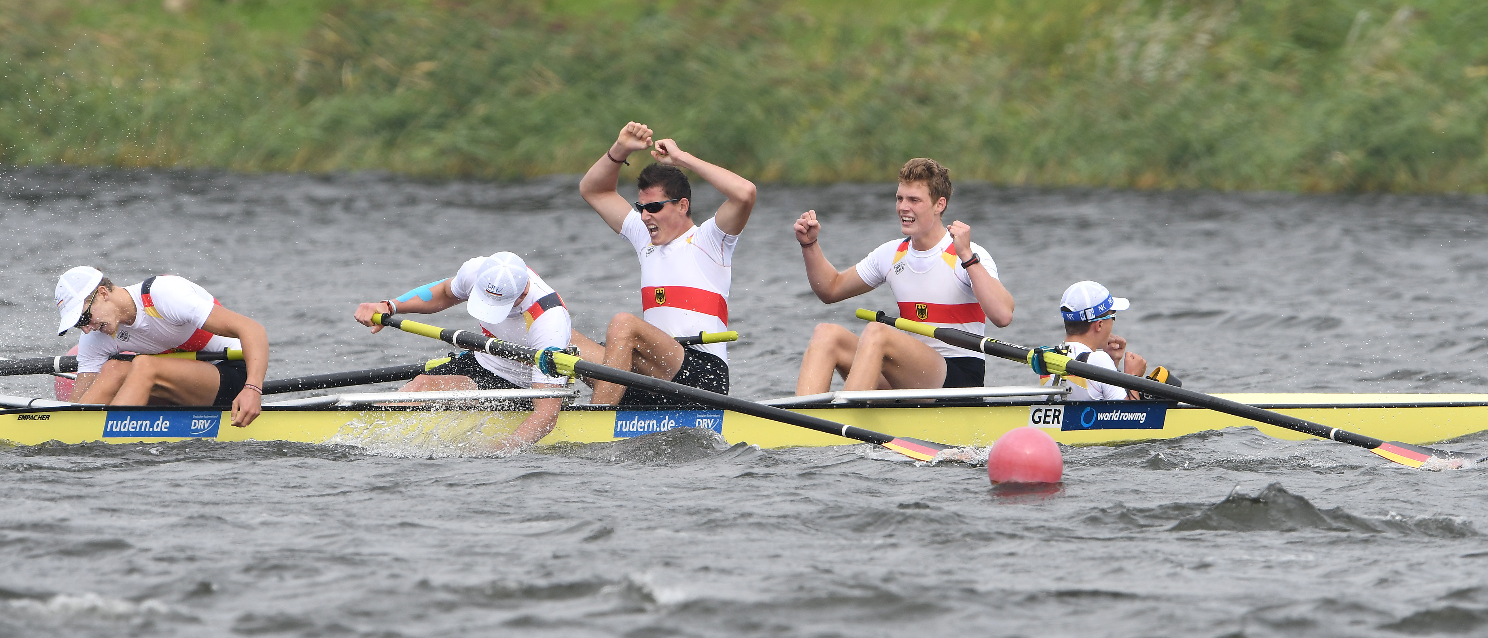 Es änderte sich nicht viel an den Positionen. Jedoch war für alle höchste Konzentration geboten aufgrund der schweren Bedingungen. Drei deutsche Boote büßten Plätze und Medaillen ein, wie z.B. der Juniorinnen-Achter, der kurz vorm Ziel durch einen Krebs ( das Blatt einer Ruderin blieb im Wasser hängen ) noch Gold vergab. Aber die Jungs um Oliver Peikert blieben hoch konzentriert und brachten die Vize-Weltmeisterschaft sicher ins Ziel. Eine Länge hinter Italien und eine vor USA, die knapp noch Bronze vor den Serben ins Ziel retten konnten.