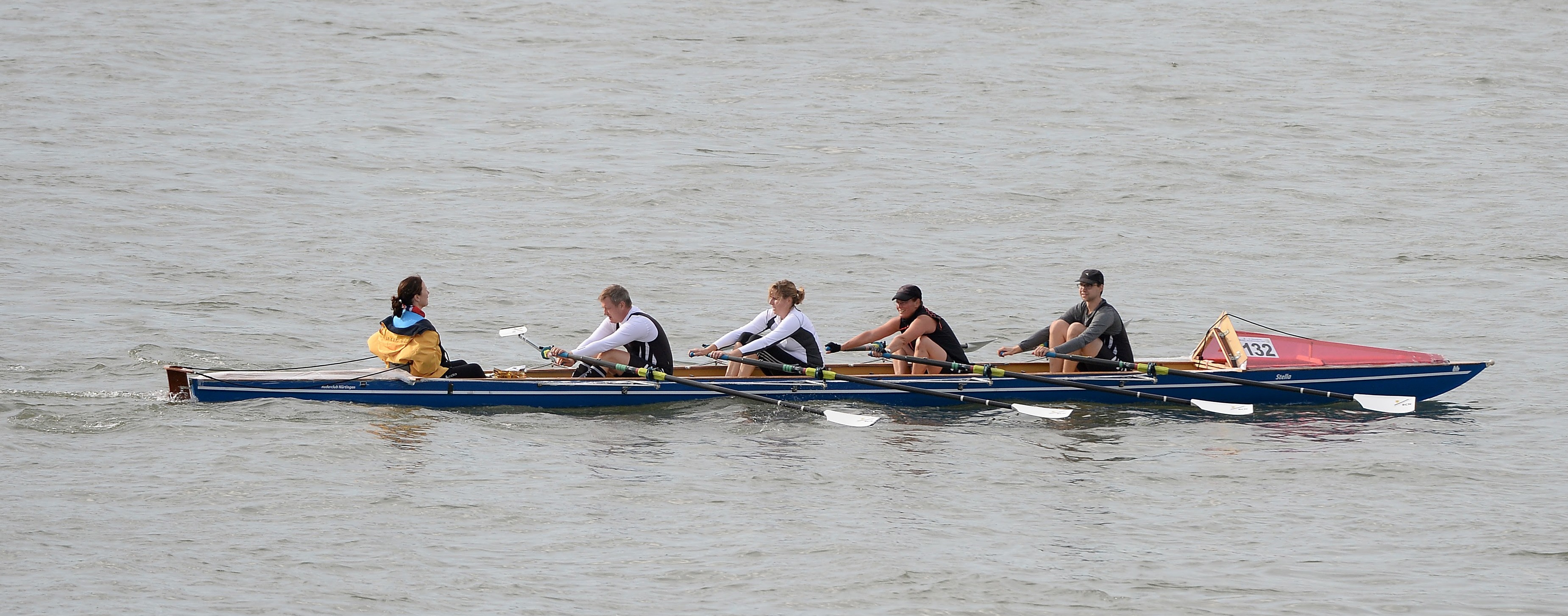 Bei ordentlichen äußeren Bedingungen – bedeckt, ca. 15°C und nur leichtem, auf den meisten Abschnitten der kurvigen Strecke schiebendem Südwind – gingen die 160 Boote mit 1,5- bis 2-Minuten-Startabständen in 29 Wertungsklassen ins Rennen. Die RCN-Mixed-Crew konnte trotz des Altersdurchschnitts von 45 Jahren aufgrund eines (zu) jungen Teamitglieds nicht in der älteren MDA43-Mixed-Kategorie (Mindestdurchschnittsalter 43 Jahre) antreten, sondern musste sich der „offenen“ Konkurrenz (ohne Altersbeschränkung) stellen. Dieses offene Mixed-Rennen war mit 3 Booten, in denen sich amtierende Vize-Weltmeister, Ex-Weltmeister, Rio-Teilnehmer und Ergometer-Weltrekordler tummelten, das am hochwertigsten besetzte der Veranstaltung. Vorne Mitzumischen war aber ohnehin nicht das Ziel des RCN-Quintetts, sondern es ging ums Durchhalten und darum, gut durch die ungewohnten Wellen zu rudern und zu steuern. Der Wechsel auf dem Steuerplatz zwischen den steuernden Ruderinnen Wagner und Hendel war auf recht lebhaftem Wasser mindestens so herausfordernd wie das Rudern selbst. In 2:39:28h wurde schließlich die Marathonstrecke bewältigt, womit man 10. von 13 Teams in der offenen Mixed-Klasse bzw. 23. aller 38 Mixed-Team war.