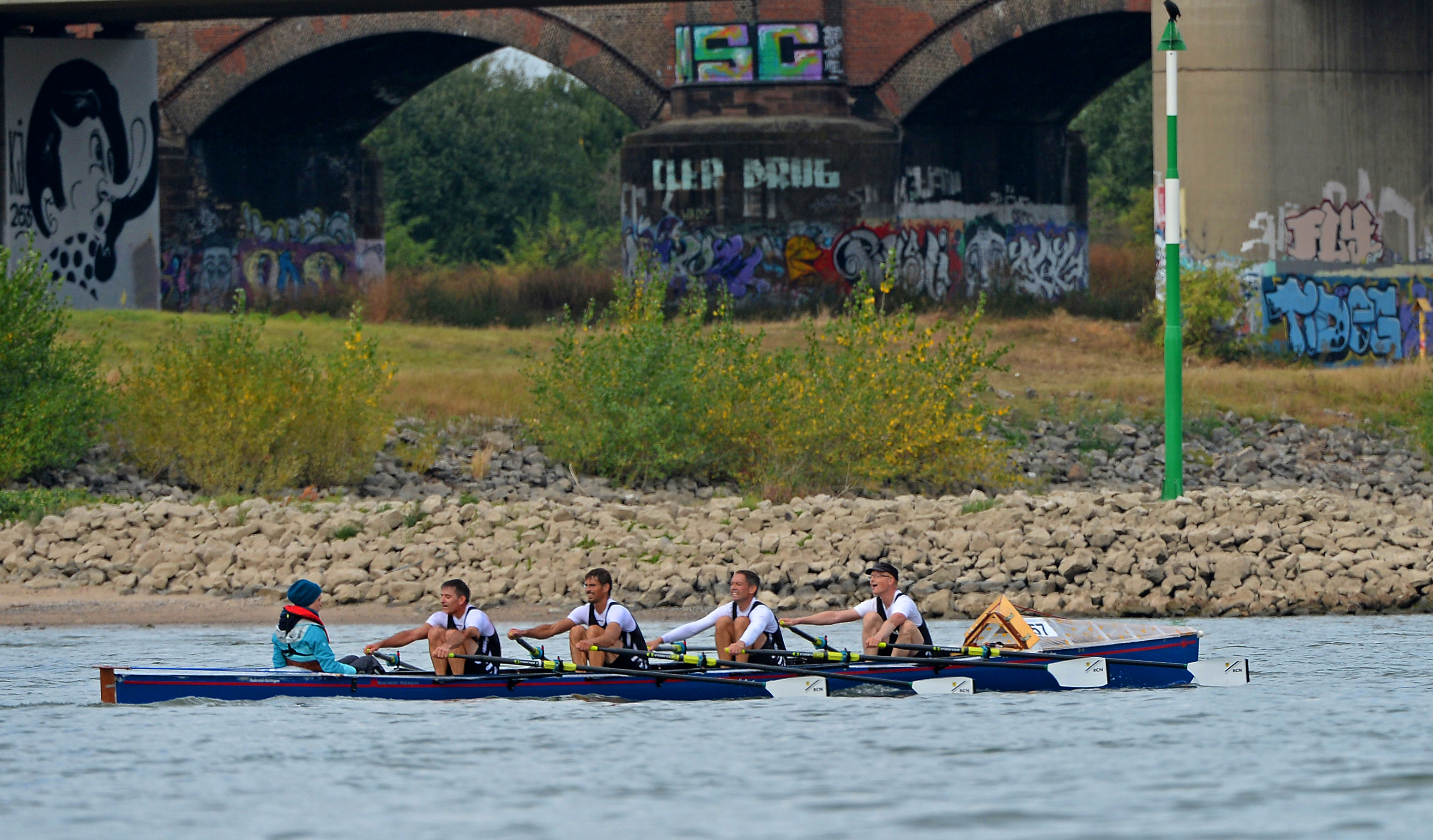Einen etwas unvermittelten, rumpligen Start gab es für den Nürtinger MDA43-Vierer, nachdem just in dem Moment, als man ablegte, eine flussabwärts fahrende Dreier-Armada Frachtschiffe nahte. Auf Basis der Vermutung – oder eher Hoffnung – schneller als diese zu sein, legte man ohne Warmrudern parallel zum ersten der Schiffe los, um sich dadurch unruhiges Fahrwasser und langwierige Überholmanöver im späteren Rennverlauf zu ersparen. Diese spontane Entscheidung erwies sich als eine gute, denn die Nürtinger Crew konnte sich schnell von der Großschifffahrt absetzen und bei vergleichsweise ruhigen Bedingungen mit nur gelegentlichen Wellen und Kabbelwasser infolge von Bergfahrern gut ins Rennen finden. Schlagmann Norbert Schmid gab eine hohe Frequenz vor, welche die restliche Crew aufnahm und das Boot flüssig und kraftvoll die Strecke herunter schob. Auf dem Steuerplatz traf Merit Linder nach vorsichtigerem Beginn mehr und mehr die optimale (Kampf-)Linie und steuerte sicher durch die Großschifffahrt und eine Vielzahl von vorher gestarteten Ruderbooten; zunächst nur jenen der eigenen Rennklasse, später auch noch durch fast das komplette 8-Boote-Feld des MDA50-Rennens. Die Zwischenzeit in Dormagen war schon vielversprechend, die Endzeit in 2:09:50h angesichts der geringen Fließgeschwindigkeit noch viel mehr. Wie viel genau, zeigte sich erst im Verlauf der weiteren Zielankünfte: Nur ein einziges Team – die internationale Renngemeinschaft aus Neuwied, Bad Cannstatt und Tilburg – absolvierte in der deutlich schnelleren Bootsklasse der ungesteuerten Fünfer die Strecke noch knapp 2,5 Minuten fixer. Hingegen wurde das restliche Feld der Dreier, Vierer und Fünfer sehr deutlich um mindestens 4,5 Minuten distanziert, darunter auch die Gewinner in der offenen Männer-Viererklasse, die Titelverteidiger und Seriensieger der Wertung „Schnellstes Nicht-Rhein-Vereinsboot“ vom Ruderverein Berlin von 1878. Den Wanderpokal für diese Sonderwertung konnten dieses Mal die Nürtinger für ein Jahr mit an den Neckar nehmen. (ma)