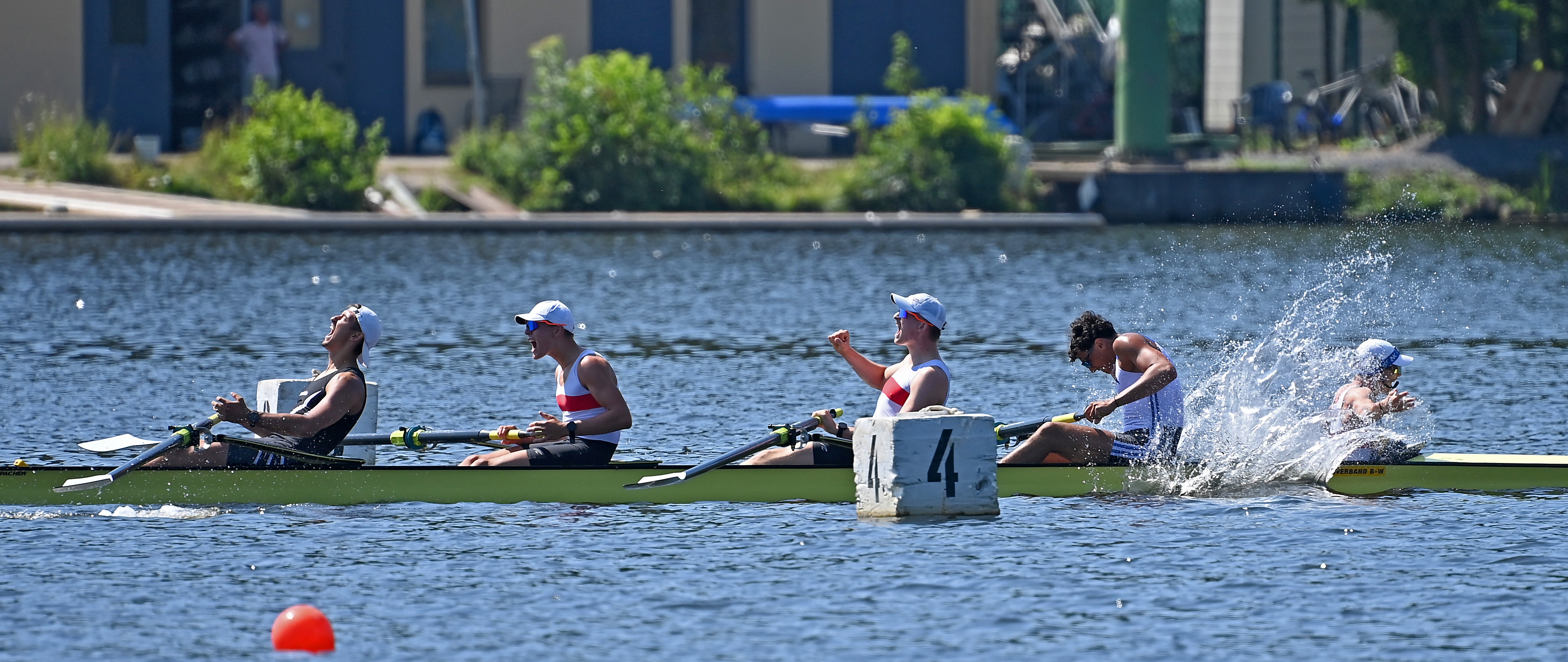 Völlige Erschöpfung – riesengroßer Jubel : Levin Burkhart (ganz links) vom Ruderclub Nürtingen gewinnt auf der Deutschen Juniorenmeisterschaft den Junioren-Vierer mit Steuermann und löst mit seinen Bootspartnern das WM-Ticket.