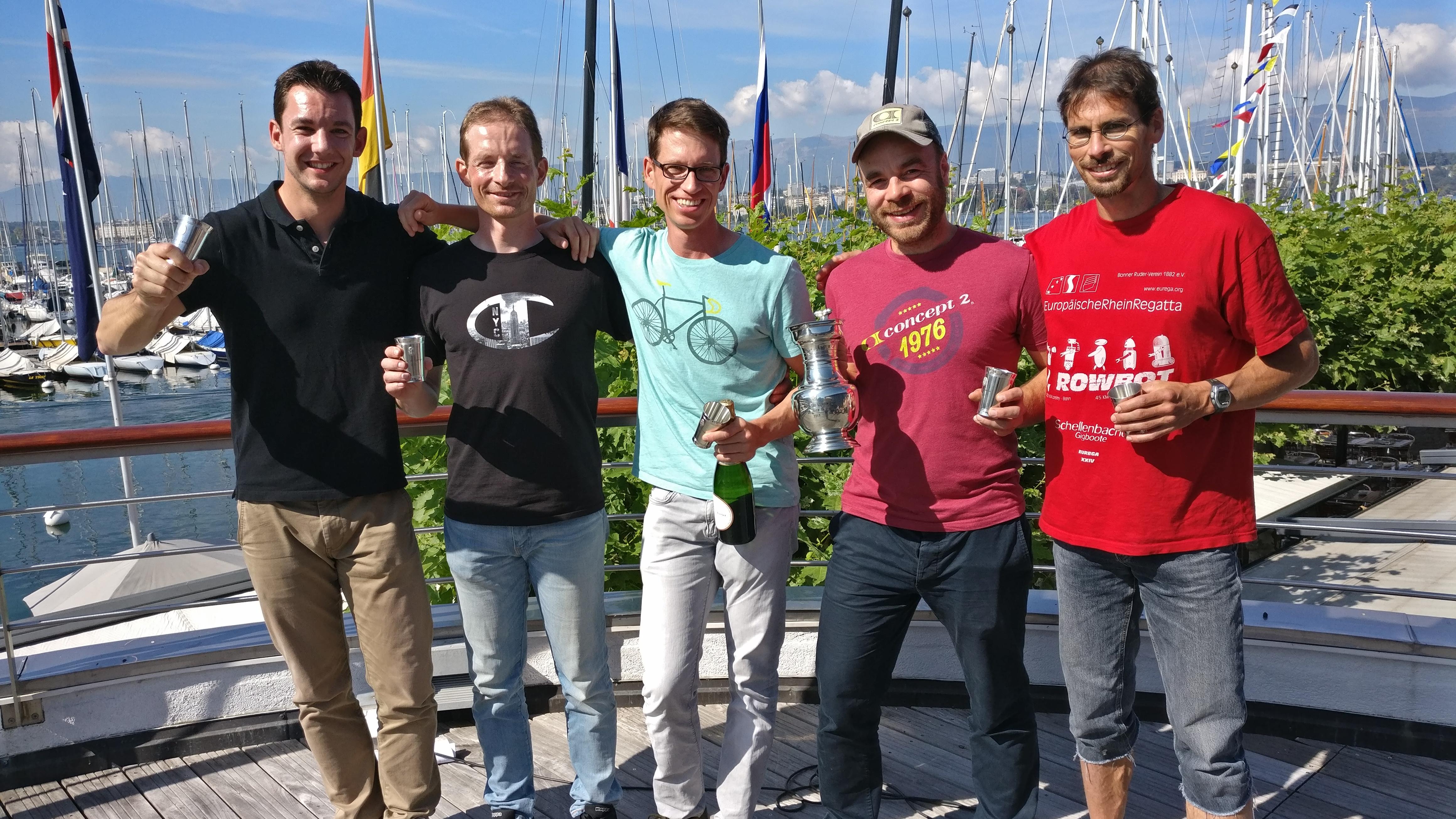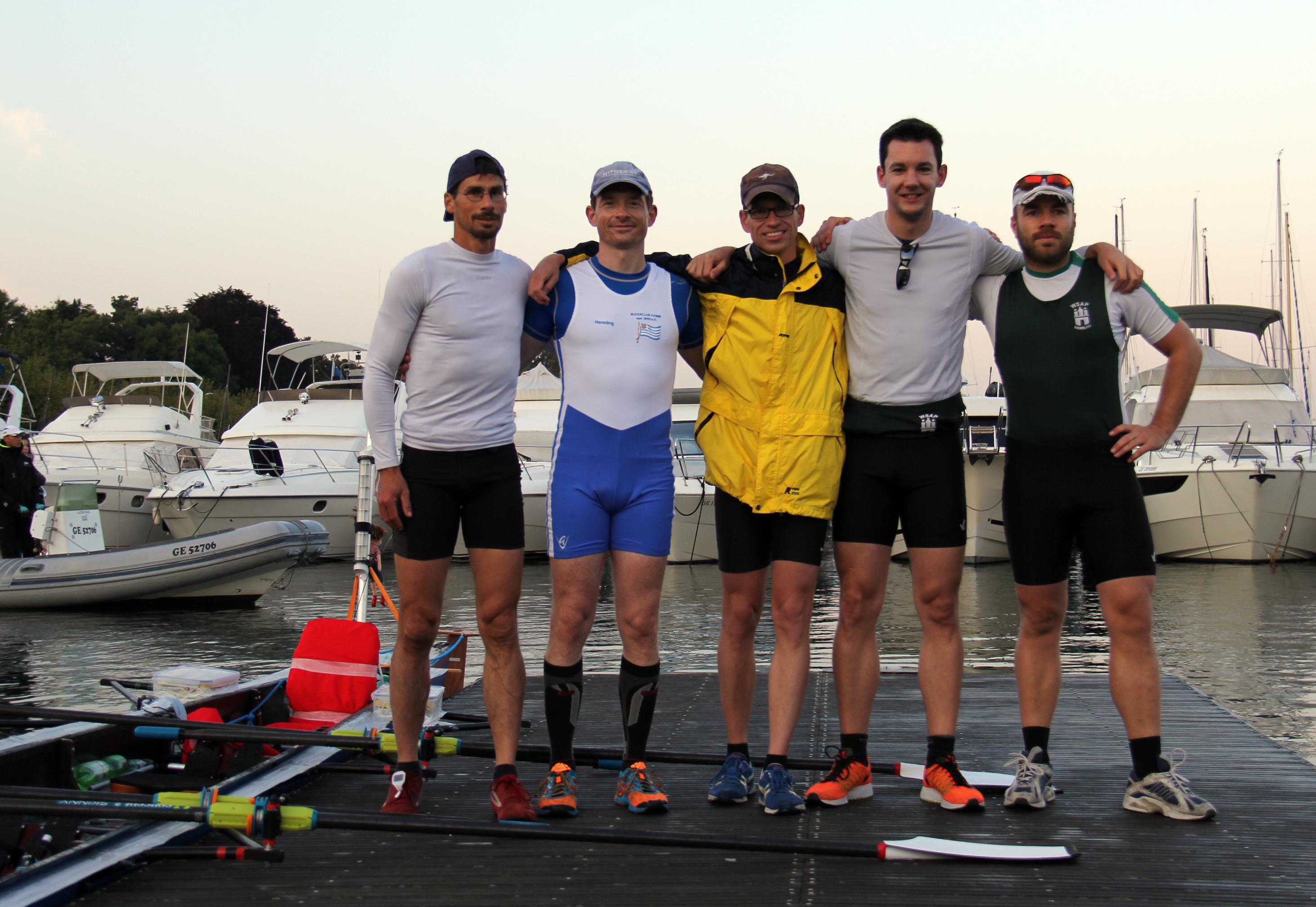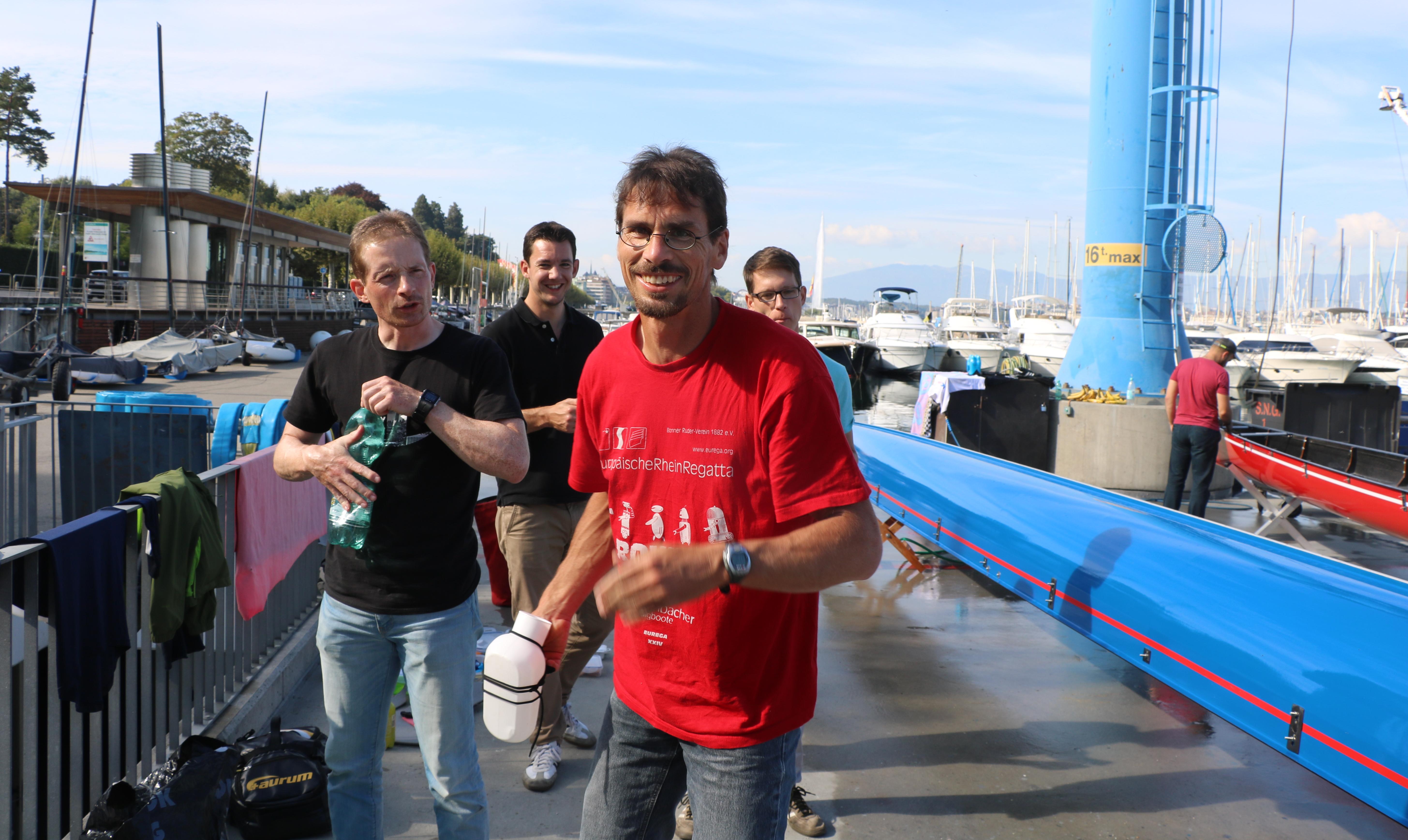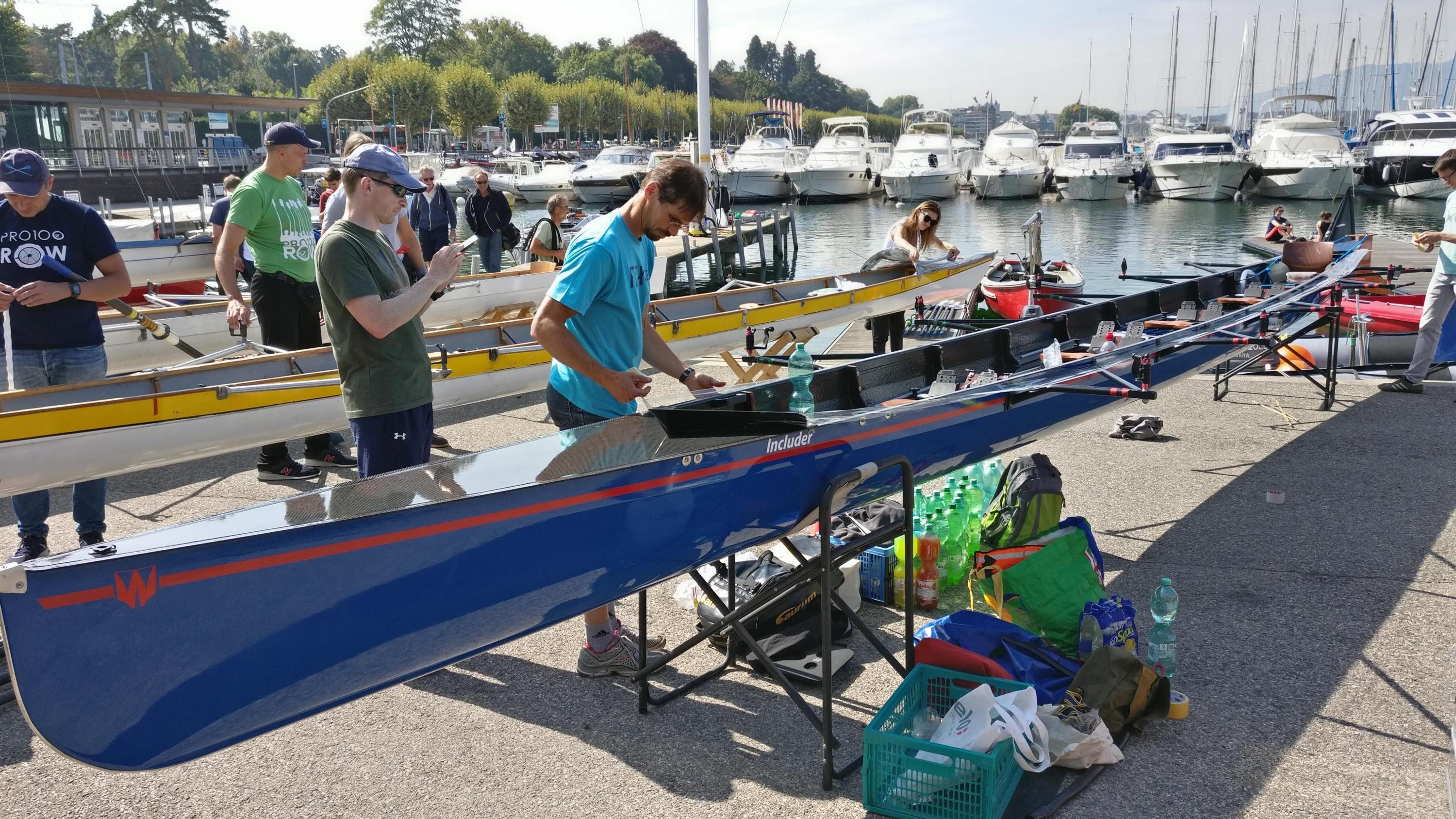 Das Kennenlernrudern musste aufgrund der Entfernung und zahlreicher persönlicher Verpflichtungen und Baustellen auf ein Wochenende konzentriert werden. Anfang August traf man sich in Hamm und absolvierte eine größere und eine kleinere Runde von 80 bzw. 30 km Länge. Das gemeinsame Rudern klappte erstaunlich gut und die gute Bootsgeschwindigkeit und hohe Effizienz des Zusammenspiels ließ die Hoffnung reifen, dass man gegen das starke Boot der Kollegen aus dem Rheinland mit niederländischer und Cannstatter Ergänzung – im Vorjahr in 4/5-Besetzung unglücklicher Tour-Zweiter mit historisch knappen 24 Sekunden Rückstand und Gewinner des Rheinmarathons – mehr als nur physische Präsenz gegensetzen konnte. Hinsichtlich des Bootsmaterials kämpfte man mit gleichen „Waffen“: Beide Favoritenteams nutzten ihren Zugang zu Wiersma-Booten, so dass der Nürtingert "Includer" zu seinem Genf-Debut nebst seinem in Bad Cannstatt untergekommenen Schwesterschiff "Give me Five" kam. JP [„DscheiPii“] Müller sorgte als Concept2-Mitarbeiter mit einer Anreise über Zürich dafür, dass für die Regatta feinstes fabrikneues Material, soft Skinnies mit Fat2-Blättern, zur Verfügung stand.