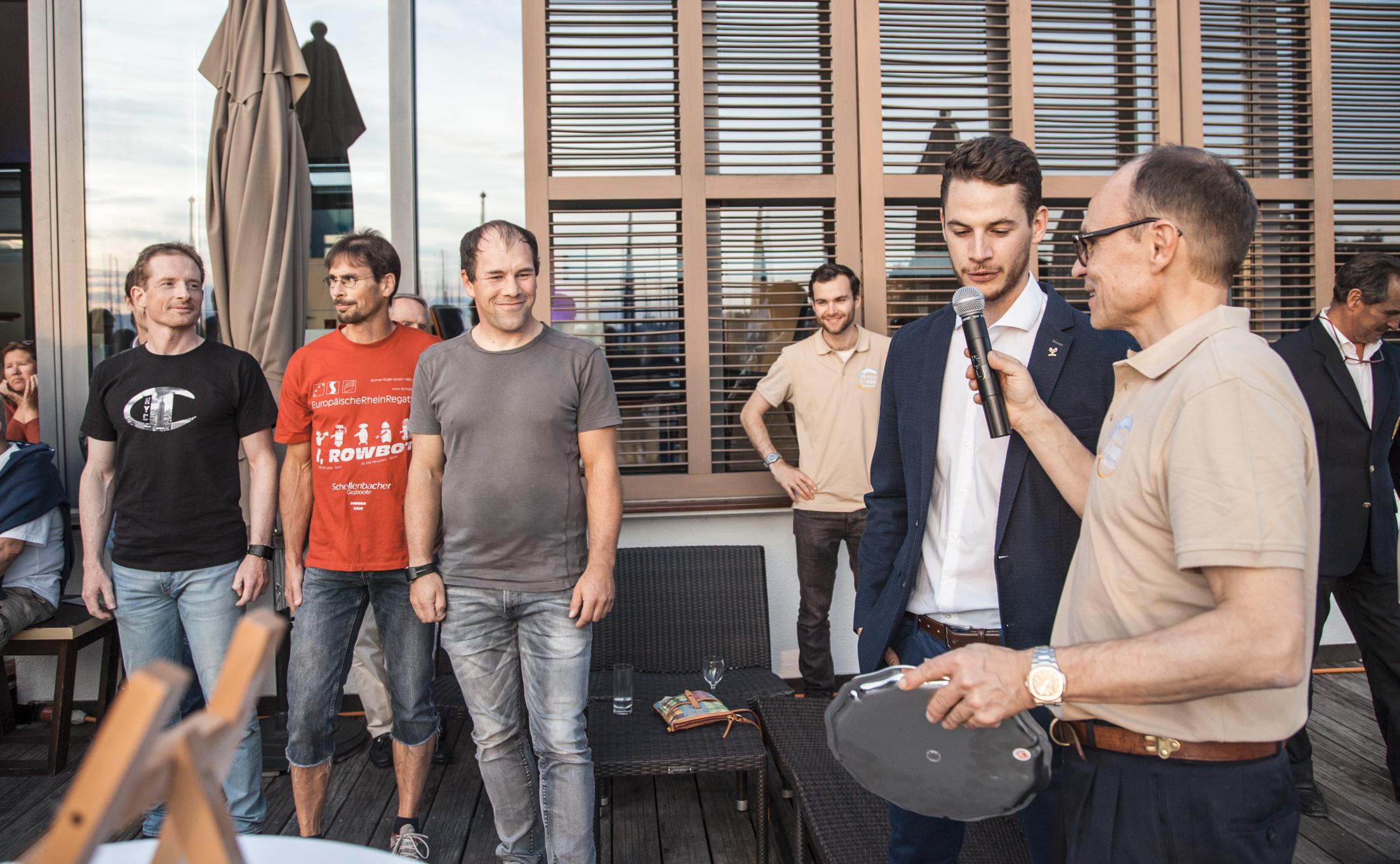 Das offizielle Programm begann um 17:30 Uhr mit der Sicherheitseinweisung. Nach einer kurzen Pause ging es mit dem Empfang, sprich Getränken von der Theke und Fingerfood nebst Ansprachen weiter. Aufgrund der Aufstellung des Masters-Rekords im Vorjahr durften Matthias und 2 seiner vor Ort weilenden Kameraden aktiv am Programm teilnehmen und wurden mit einem Zinnteller aus Händen des Rio-Olympiasiegers Lucas Tramér (LM 4-) geehrt. Nachdem die Häppchen-Tablets anfangs immer arg schnell leer gefegt waren, kam man mit zunehmender Zeit mehr auf seine Kosten. Insbesondere süße Häppchen können sie einfach, die Schweizer! Zum Abschluss des Empfangs gab es noch den aktuellen Wetterbericht: Abgesehen von der Möglichkeit thermischer Winde aus Norden während der ersten Rennstunden waren sehr gute äußere Bedingungen mit Sonne, wenig Wind und Temperaturen um 20°C zu erwarten. Großartig! Traditionell ließ man den Renn-Vortag auf der Terrasse des Lion d´Or unweit des Bunkers mit einem hopfenhaltigen Getränk ausklingen.