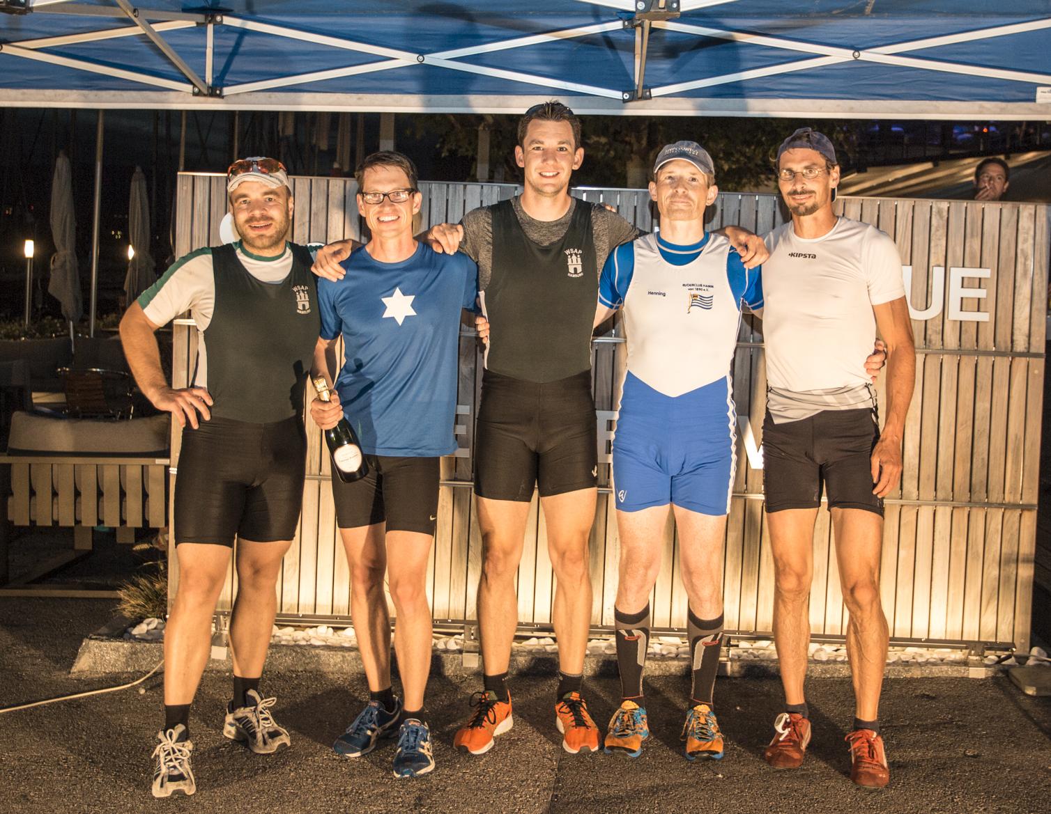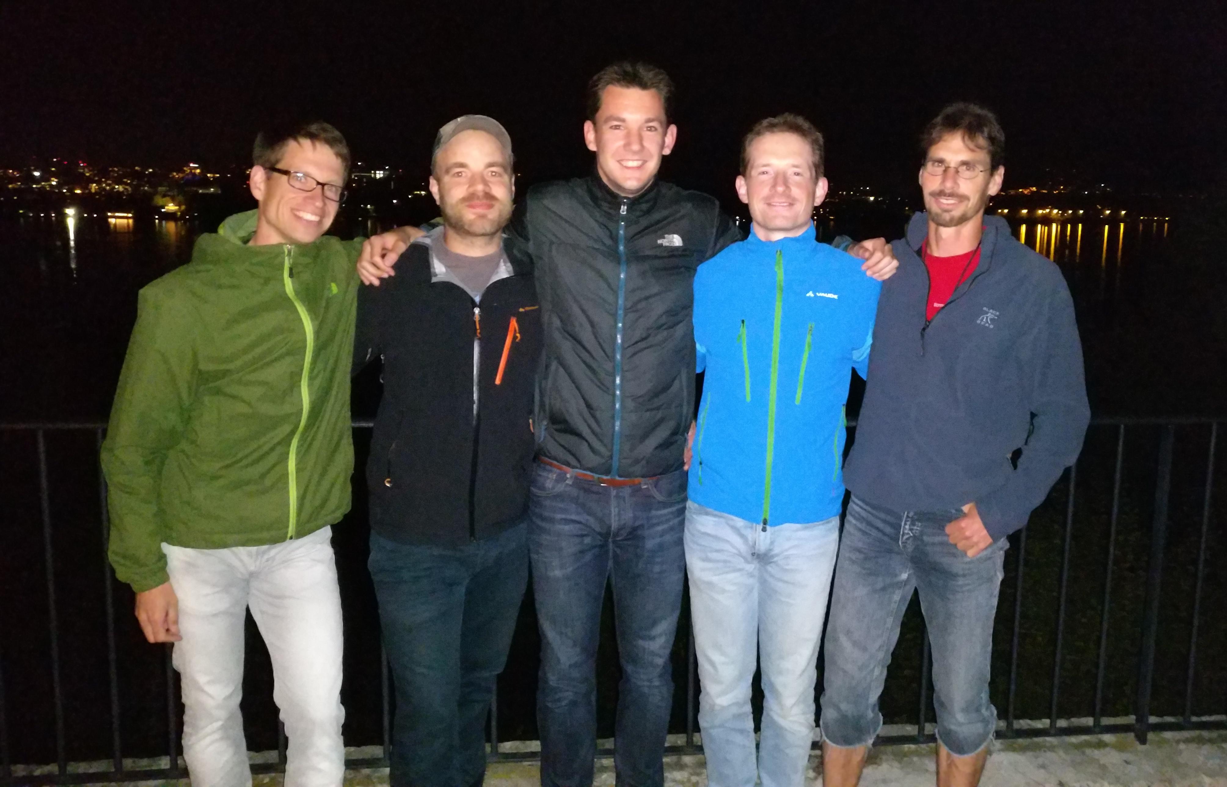 Dieselben Gestalten in veränderter Aufstellung und in Rennklamotten am nächsten Morgen, (eigentlich schon zu) kurz vor 8 Uhr: noch ein ganz fixes Team-Foto vorm Ablegen.