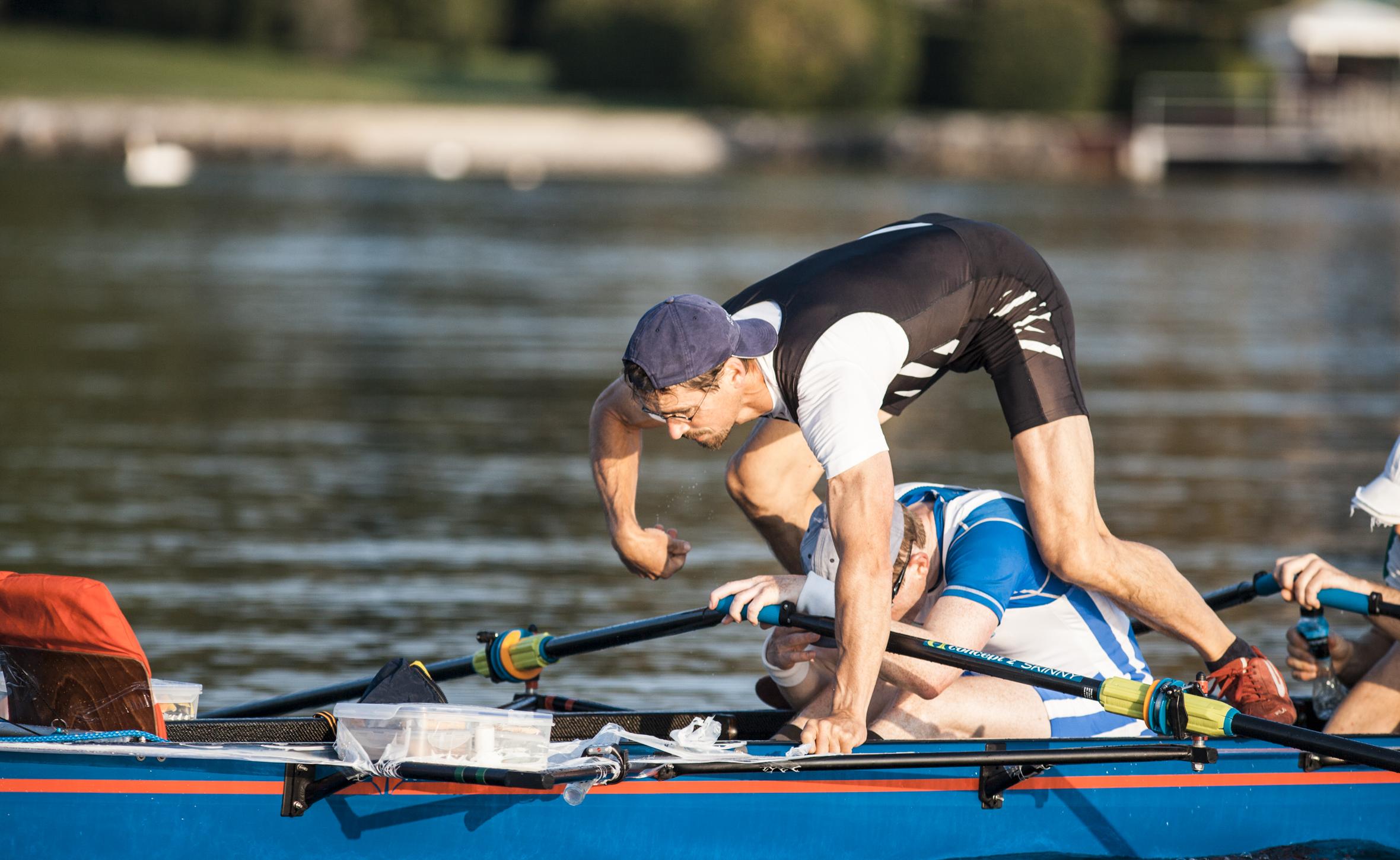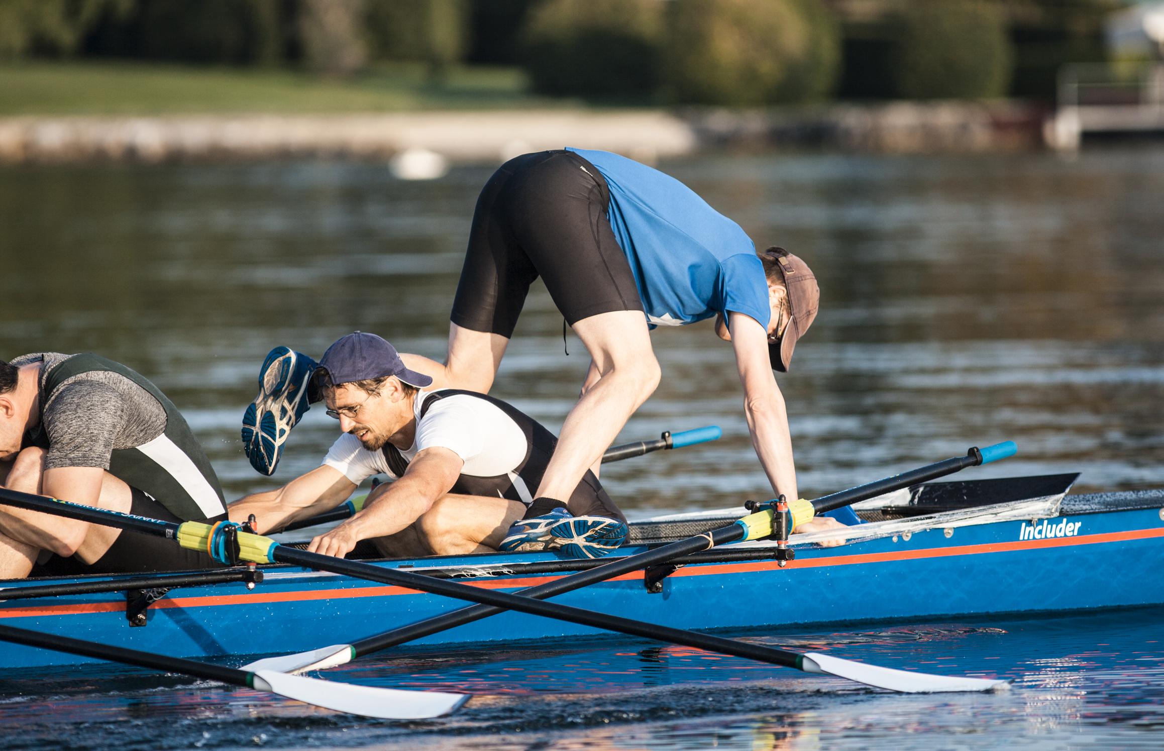 Für die Nicht-Langstreckler – so wird gewechselt: Ruderer geht aus Stemmbrett und duckt sich im Fußraum ab während der (Ex-)Steuermann durchs Boot und über den wechselwilligen Ruderer hinweg steigt.