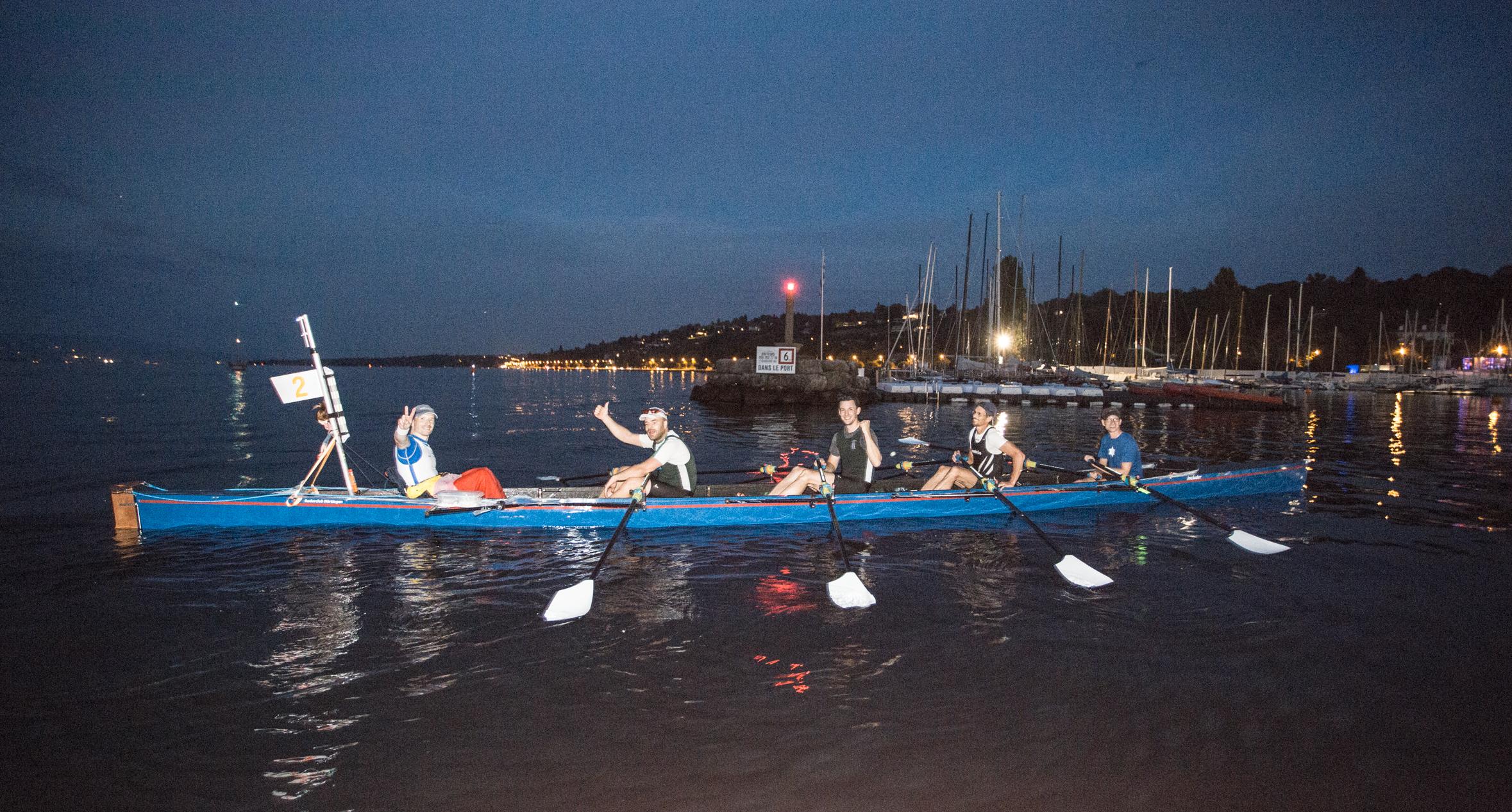 Samstag – Renntag: Aufgrund der frühen Anmeldung kam die Includer-Crew in den Genuss einer späten Zu-Wasser-Geh-Zeit. Diese und die eigentlich nur noch wenigen Arbeiten am Boot verleiteten ein wenig zum Bummeln. So kam es, dass es nach verzögertem Ablegen doch noch recht eng wurde und man den Start-Countdown in einiger Entfernung von der Startlinie vernahm. Eine Regatta von 160 km Länge wird zwar nicht auf den ersten Metern entschieden, aber aus Jux und Tollerei gleich 2 Längen her zu schenken und dem Feld hinterher zu eilen ist natürlich nicht im Sinne des Erfinders. Die schlechte Nachricht: der Start in die Regatta war alles andere optimal. Die Gute: dieser selbstverschuldete Lapsus sollte im weiteren Rennen mehr oder weniger der einzige bleiben. Zwar fand man sich ein bisschen eingekeilt im Feld hinter der Spitzengruppe wieder, aber mit ein paar „Dicken“ und „ab durch die Mitte“ war der Weg nach vorne frei. Bis zur 90°-Kurve nach ca. 1 km war man aber schon an dritter Stelle, allerdings immer noch jene 2 Längen vom Start hinter den Mitfavoriten. Die Rgm. Bad Cannstatt/Kleve/Köln/Neuwied/Tilburg wollte diese Führung nicht so ohne weiteres abgeben und hielt ordentlich gegen. Technisch sauber und mit großer Effizienz wurde Includer mit Schlagzahl 28 Zentimeter für Zentimeter herangeschoben und der minimal höhere Speed auch beim und nach dem Passieren aufrecht erhalten, um zunehmend Wasser zwischen die Boote zu bringen. Überraschenderweise gab es über die halbstündigen Wechsel und Teamveränderungen hinweg keine grundlegenden Veränderungen an diesem leichten Geschwindigkeitsüberschuss – der Vorsprung wuchs beim mittlerweile etwas ruhigeren Streckenschlag von 26,5 bis 27 langsam aber stetig weiter an. Am ersten ortsfesten Zeitnahmepunkt in Rolle betrug er bereits unerwartet große 4 Minuten. Zudem war man auch sehr flott unterwegs und lag mit 2:20 Stunden Ruderzeit lediglich 2 Minuten über der Rekordmarke von 2011, auch eine Folge dessen, dass der befürchtete Gegenwind auf diesem Streckenabschnitt ausblieb und stattdessen leichter Rückenwind vorherrschte. Bis zum Ostende des Genfer Sees konnte der Vorsprung weiter ausgebaut werden, wenn auch etwas weniger schnell. Le Bouveret durchfuhr das Includer-Team nach einer Ruderzeit von 6:44 Stunden deutlich über dem Rekord (13 Minuten), die Konkurrenten folgten 8 Minuten später. Gegen ein „normales“ Team ohne Frage ein beruhigender Vorsprung, nicht aber gegen diese Ansammlung von Langstreckenfreaks mit berühmt-berüchtigter zweiter Rennhälfte, insbesondere unglaublichen schnellen letzten 2 Stunden. So ging es darum, die Gegner möglichst auf Distanz zu halten und selbst fokussiert und konzentriert zu bleiben. Persönliche Ausfälle waren strengstens untersagt. Auf dem immer sehr zähen Stück entlang der französischen Küste des Genfersees bis zum nächsten Kontrollpunkt bei Sciez wurde die Vorgabe „Vorsprung verteidigen“ ganz gut erfüllt. In Sciez, erreicht bei 9:51 Stunden, war man immer noch 7 Minuten voraus. Diese auf 28 km zu verteidigen schien machbar, auch wenn die Kollegen im Vorjahr 6 Minuten nahezu „zugefahren“ hatten. Allerdings bewegten sich Max und JP freilich schon seit 4 Stunden in Ausdauer-Gefilden, die sie noch nie zuvor betreten hatten. Mit dem großen Ziel vor Augen und dem Wissen der außergewöhnlichen Steherqualitäten der Kontrahenten im Hinterkopf wurden im letzten Sechstel des Rennens nochmals alle Kräfte mobilisiert und dabei Includer streckenweise zum Fliegen gebracht. Die sonst nahezu endlose Lichterkette der Uferpromenade schien in diesem Jahr nicht ganz so lang zu sein bis es endlich im Bereich der SNG-Mole Licht wurde und der erlösende Böllerschuss erklang, der 5 Ruderer zu glücklichen Genf-Siegern machte. Die magische 12-Stundengrenze, die eigentlich schon in weitere Ferne gerückt war, wurde aufgrund des starken Finishs gar nicht so weit verfehlt – 12:02 Stunden betrug schließlich die Ruderzeit, die fünftbeste in der 45jährigen Regattageschichte! Die harte Konkurrenz aus Bad Cannstatt/Kleve/Köln/Neuwied/Tilburg, die über die gesamte Strecke mehr oder weniger gut in Sichtweite war und den Druck stetig aufrecht erhalten hatte, kam 9 Minuten später an und erzielte fast sekundengenau dieselbe Zeit wie im Vorjahr.