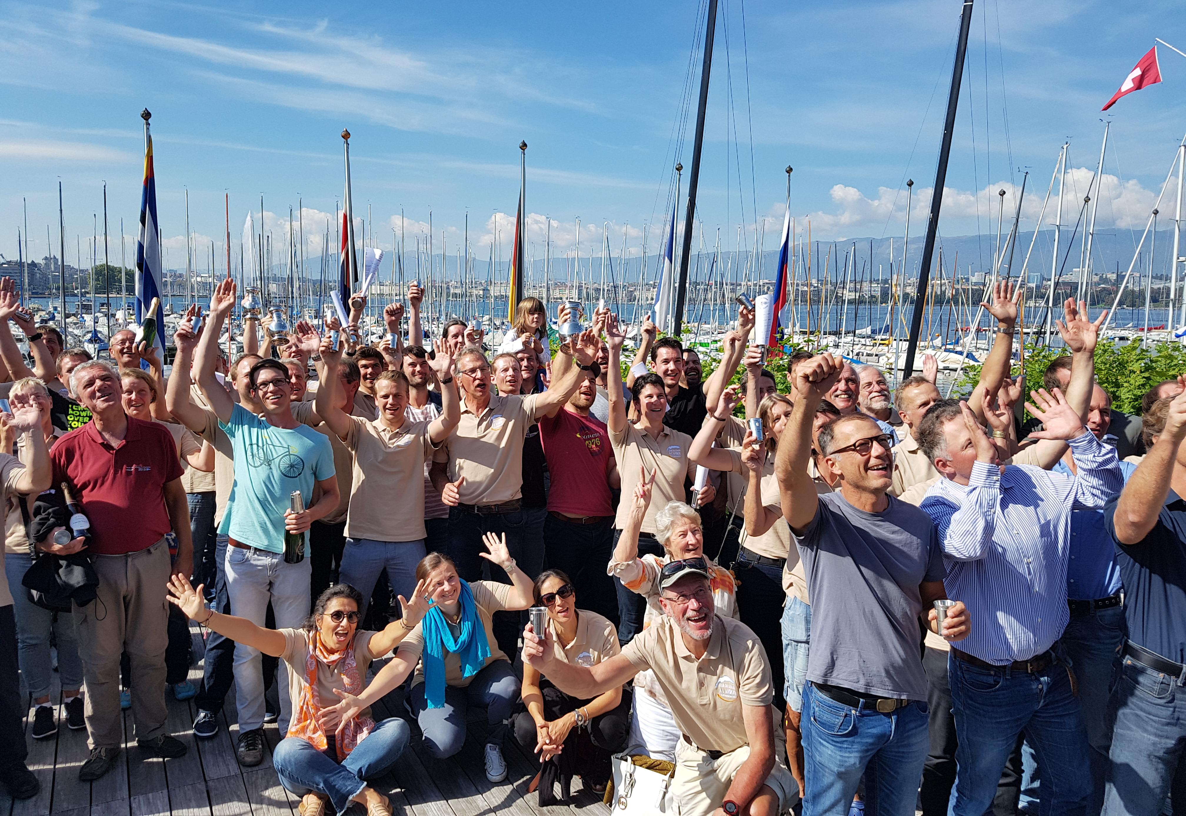 Ein weiteres Muss: das Nachher-Lac Léman-Bezwinger Mannschaftsbild der müden aber glücklichen Krieger direkt nach dem Anlegen, erfreulicherweise mit Siegerschampus.