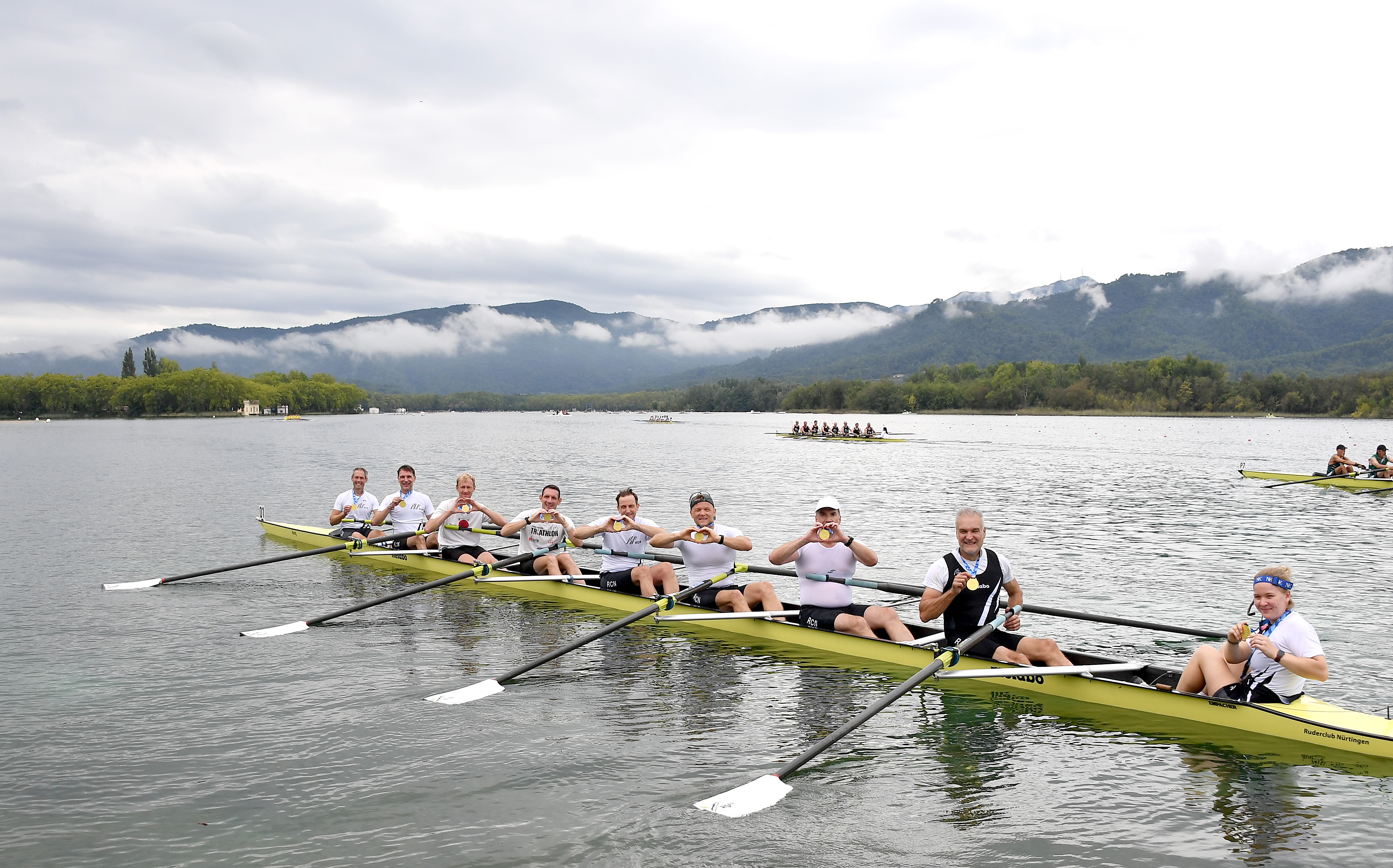Mit zu den spannensten Rennen überhaupt gehörte der Mastersachter der Männer in der Altersklasse E. In dieser Altersklasse muss das Durchschnittsalter aller acht Ruderer mindestens 55 Jahre betragen. Und genau in dieser Altersklasse startete auch die Mannschaft vom Ruderclub Nürtingen. Aufgrund physisch bedingter Ausfälle saßen in der unter deutscher Fahne startenden Renngemeinschaft neben Albrecht Rosenfeld, Christian Bartels, Gisbert Zahn, Martin Fouqué und Volker Wintergerst vom Ruderclub Nürtingen noch Jörg Spiegel vom Ruderclub am Wannsee Berlin sowie Markus Baumann und Andi Schwab von der RG Waiblingen. Und obwohl die Mannschaft in dieser Besetzung nicht einmal zusammen trainieren konnte, ging die Crew mit einem klaren Rennplan und hoch ambitioniert ins Rennen. Um sich bereits am Start eine gute Ausgangsposition zu sichern, ging es gegen die Mannschaften aus Großbritanien, Frankreich, Estland, Brasilien und Spanien mit einem Blitzstart auf die Strecke. Unter den Anweisungen ihrer Steuerfrau Natascha Spiegel absolvierte die Crew bereits nach 300 Meter den ersten Druckspurt und konnte sich auf diese Weise an die Spitze des Feldes setzen. Zur Streckenhälfte betrug der Vorsprung auf das zweitplazierte Boot aus Frankreich gerade einmal etwas mehr als ein Luftkasten. Während die Mannschaft aus Estland als drittes noch folgen konnte, waren die anderen Boote zu diesem Zeitpunkt bereits um mehr als eine Bootslänge zurückgefallen. Auf dem zweiten Streckenabschnitt entwickelte sich ein stetig zunehmender, äußerst dramatischer Bort-an-Bort-Kampf zwischen der deutschen Renngemeinschaft und dem französischen Boot. Immer wieder versuchten die Franzosen mit Druck den Vorsprung zuzufahren, sodass die Nürtinger Crew bis zum Schluss immer wieder mit Druck- und Schlagzahlerhöhungen gegenhalten musste. Und auch nach einem mehr als 200m langen Endspurt war der Zieleinlauf so knapp, dass beide Mannschaften völlig entkräftet auf das offizielle Ergebnis des Schiedsrichters warten mussten. Erst mit der Durchsage, dass die Nürtinger Crew mit einem Vorsprung von gerade mal 0,5 Sekunden gewonnen hatte wurde es wieder laut und jeder, der noch jubeln konnte, schrie seine Freude über den Sieg hinaus. Schließlich wussten die Nürtinger, dass mit diesem Sieg das eigene Großboot alle national und international möglichen Titel binnen drei Jahre errudert hatte. Nach der Goldmedaille bei den Deutschen Mastermeisterschaften in Köln 2023, dem Sieg bei der Euromasterregatta in München 2024, wurde mit dem Landesmeistertitel und dem Sieg bei der World Rowing Master Regatta 2025 das Titelquartett eindrucksvoll vervollständigt.