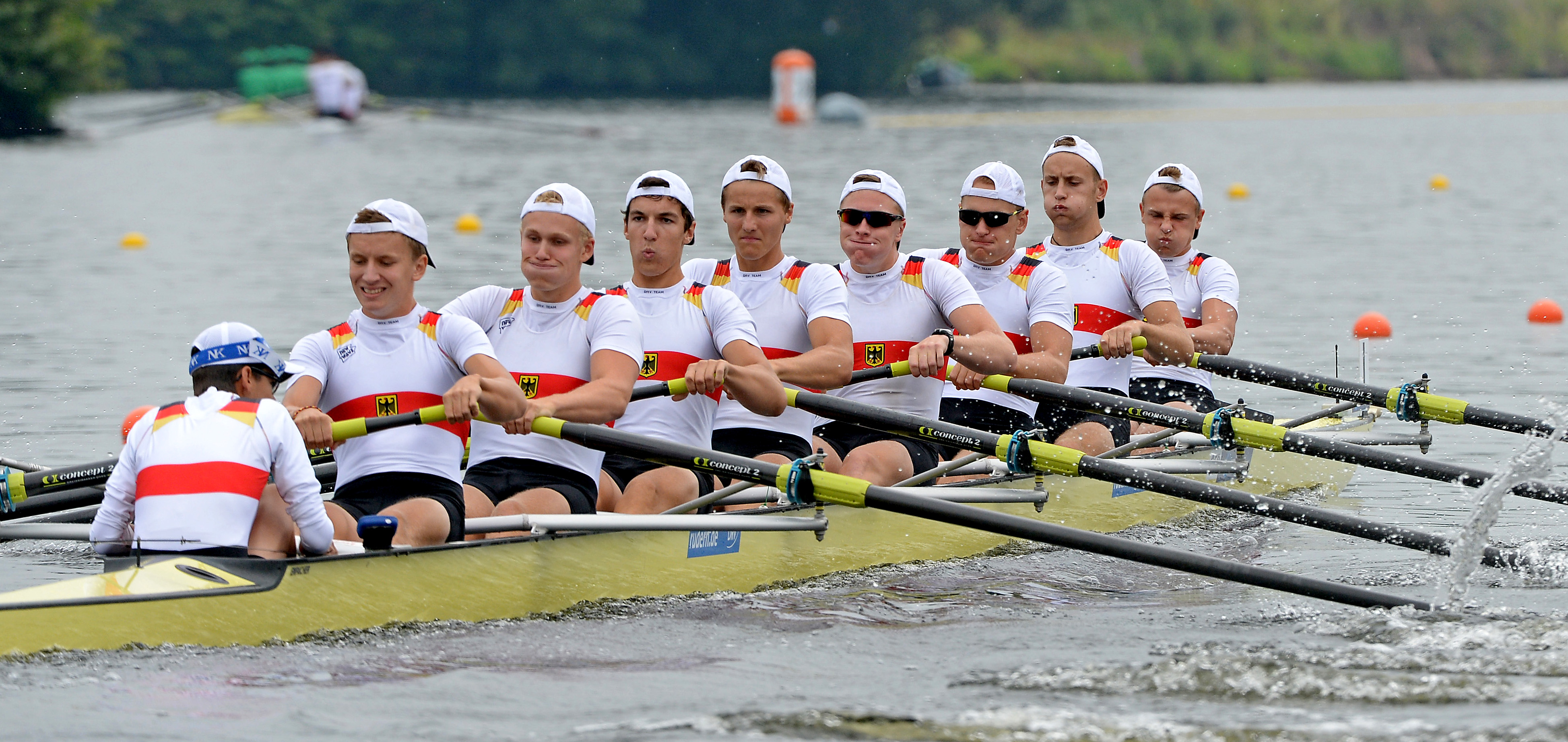 Kraft pur: Der deutsche Junioren-Achter mit Schlagmann David Wollschlaeger (Zweiter von links) und Nick Blankenburg (ganz rechts) im Bug.
