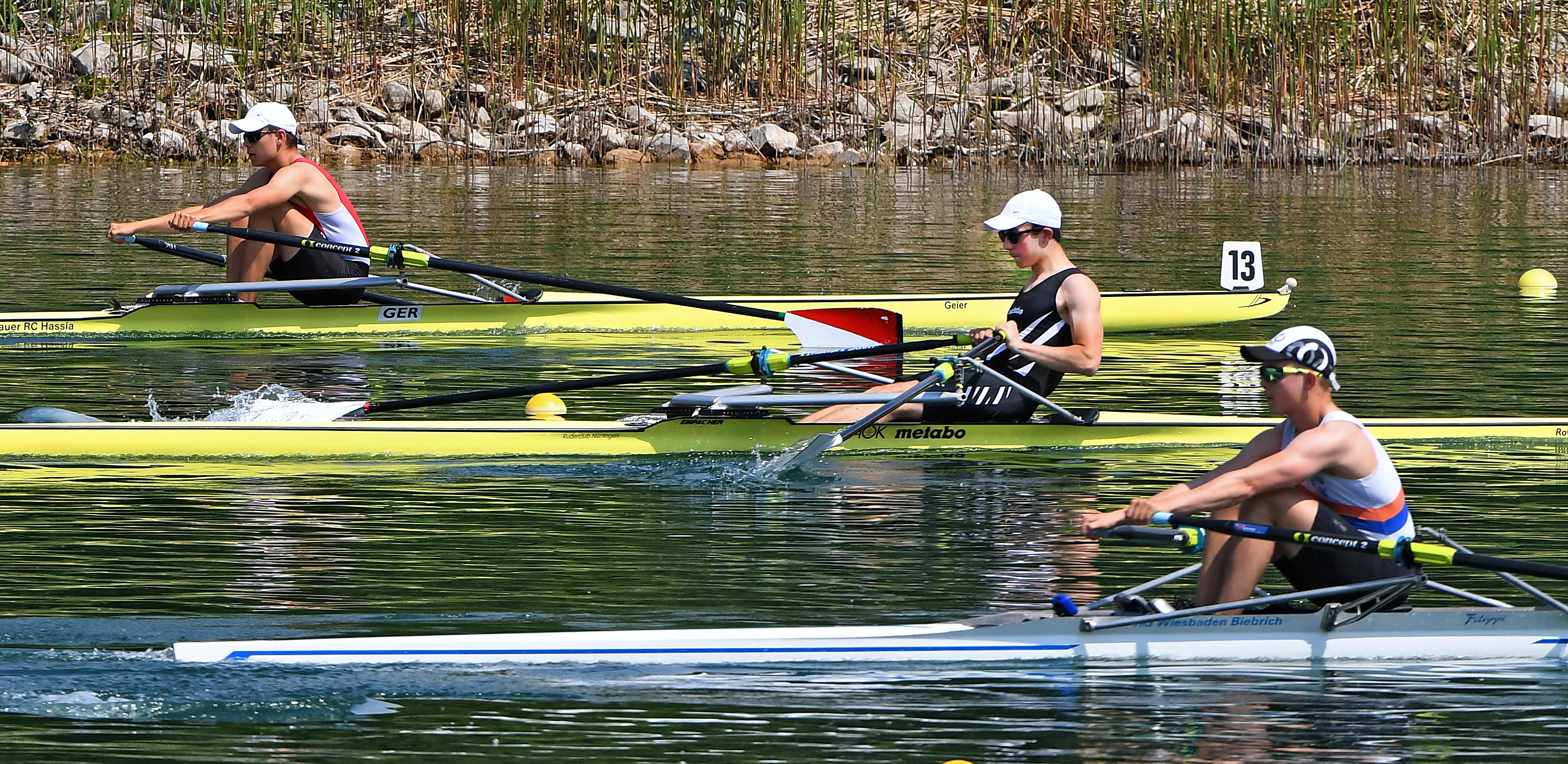 Nils Weiß, der seine Stärke im B-Junioren Einer in dieser Saison schon mehrfach bewiesen hatte, bestätigte dies am ersten Renntag in Köln erneut. Nach anfänglichen Startschwierigkeiten brauchte er zwar bis zur Hälfte es Rennens, um wieder auf das führende Boot aufzuholen. Dann allerdings ließ er sich den Sieg nicht mehr nehmen und sicherte sich so den Platz fürs erste Finale am Sonntag. Dort fand er sich mit den Besten seiner Klasse aus Deutschland wieder. Nach wiederum leichten Startschwierigkeiten und kleineren Problemen beim Steuern, erreichte er schließlich einen hervorragenden dritten Platz.