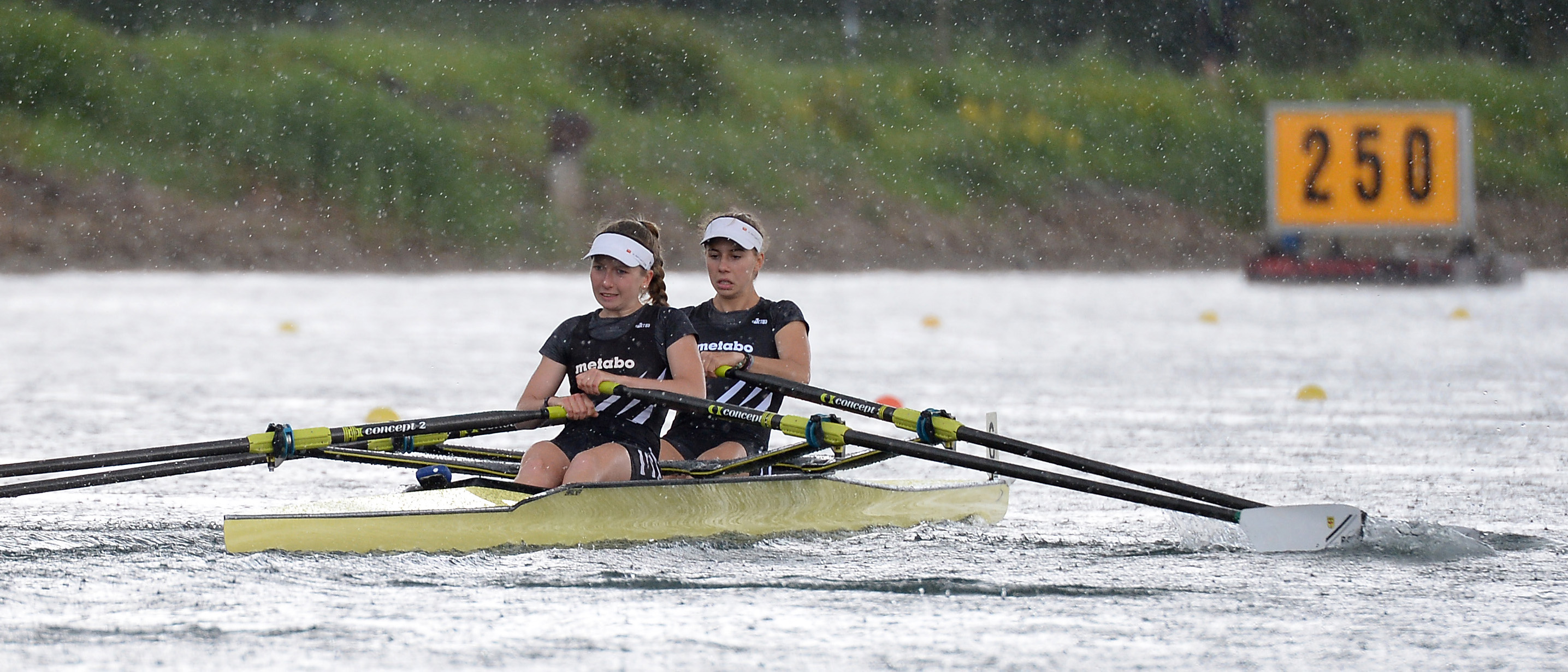 Julia Gensicke (links) und Pauline Sauter ließen sich auch nicht vom Regen stoppen und holten im leichten Doppel-Zweier und Doppel–Vierer insgesamt vier Tagessiege ab. Sie bleiben damit in diesem Jahr weiter ungeschlagen.