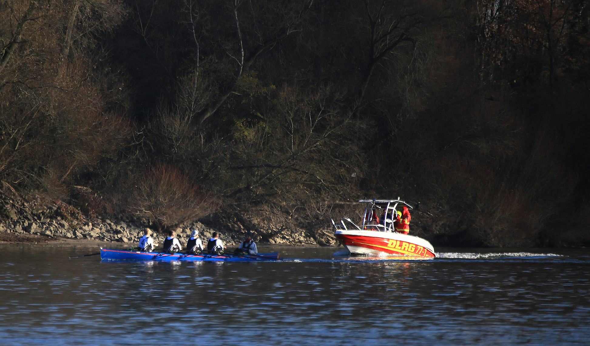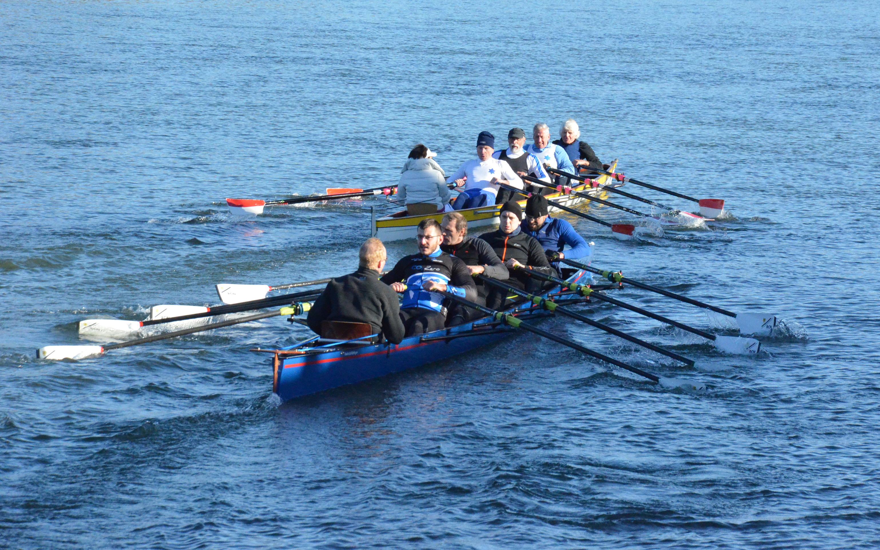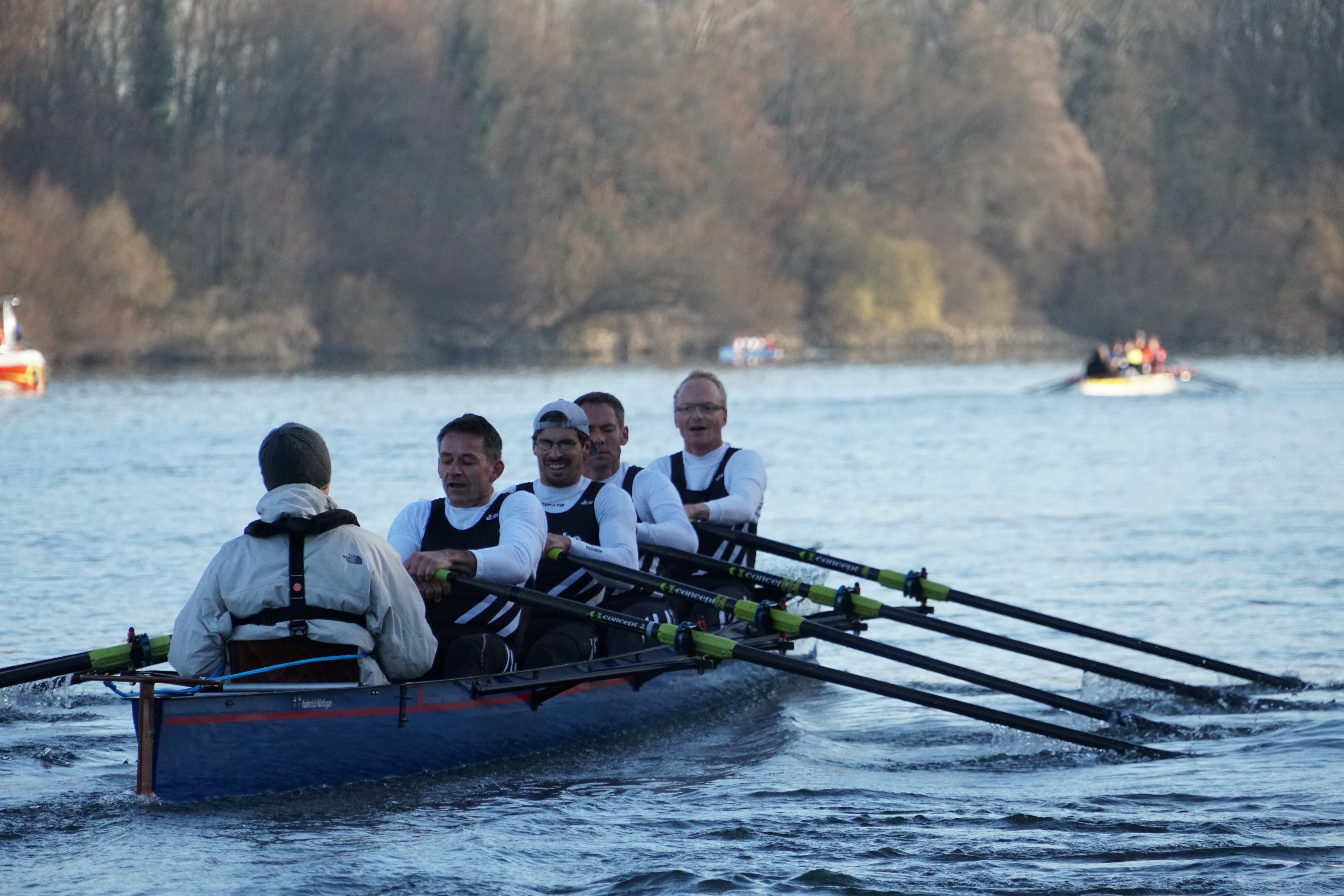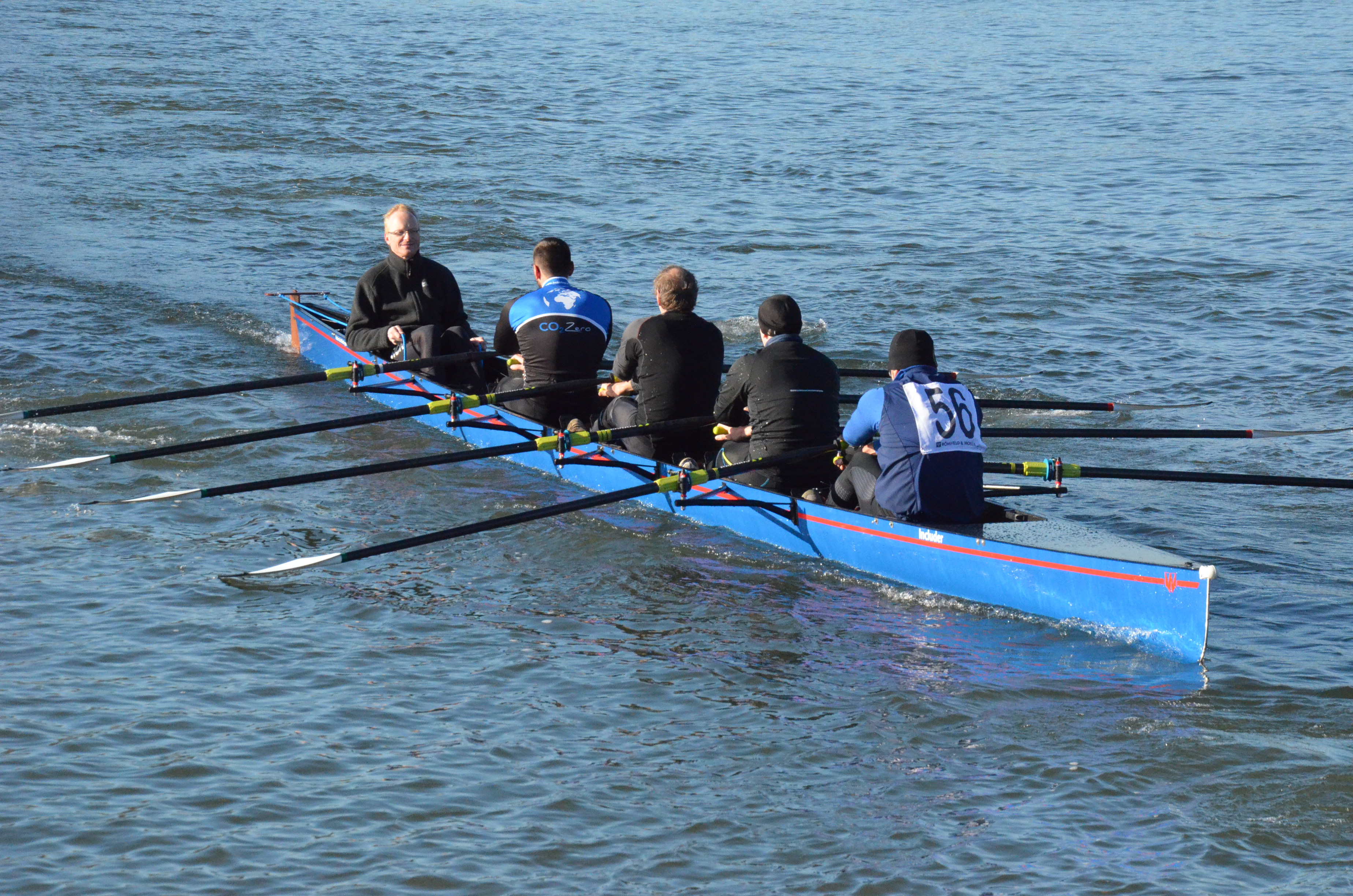 Nachdem die Mainzer Nikolausregatta am ersten Dezembersamstag aus Nürtinger Sicht früher immer ein exklusives Ereignis von/für Matthias Auer war, erfreut sich die Breitensport-Veranstaltung in jüngerer Zeit zunehmender Beliebtheit. Nach fünf RCN-Teilnehmern im Vorjahr konnten sich dieses Jahr satte acht RCNler für die Jahresausklangs-Regatta über 3 km mit Wende auf dem ruhigen Rheinnebenarm begeistern. In der originalen, ruhmreichen Rheinmarathon-Besetzung gingen Patrick Plagge, Martin Fouqué, Matthias Auer und Norbert Schmid an den Start. Und weil ein Mal kein Mal ist, stellte man sich in dieser Konstellation gleich in 2 Rennen der Konkurrenz, den Alters-(Leidens-)Genossen in der MDA43-Kategorie und den Ruderkollegen im besten Sportleralter in der „offenen“ Männer-Kategorie. Für die Navigation konnten zwei Mainz-erfahrene Steuerleute vom Karlsruher Rheinklub Alemannia (KRA) gewonnen werden. Auch die anderen Nürtinger Starts waren von der Kooperation mit den Karlsruher Alemannen geprägt. Götz Rosenberg wurde auf Karlsruher Wunsch für das siegambitionierte KRA-Boot in der Anfängerklasse (Frischlinge der Jahre 2015 und 2016) freigestellt. Dafür füllte Matthias Luber von der Alemannia den frei gewordenen Platz im Nürtinger Boot mit Stefan Wege, Jens Sauter und Semih Aydin, gesteuert von Patrick, auf, das in der MDA36-Klasse an den Start ging.