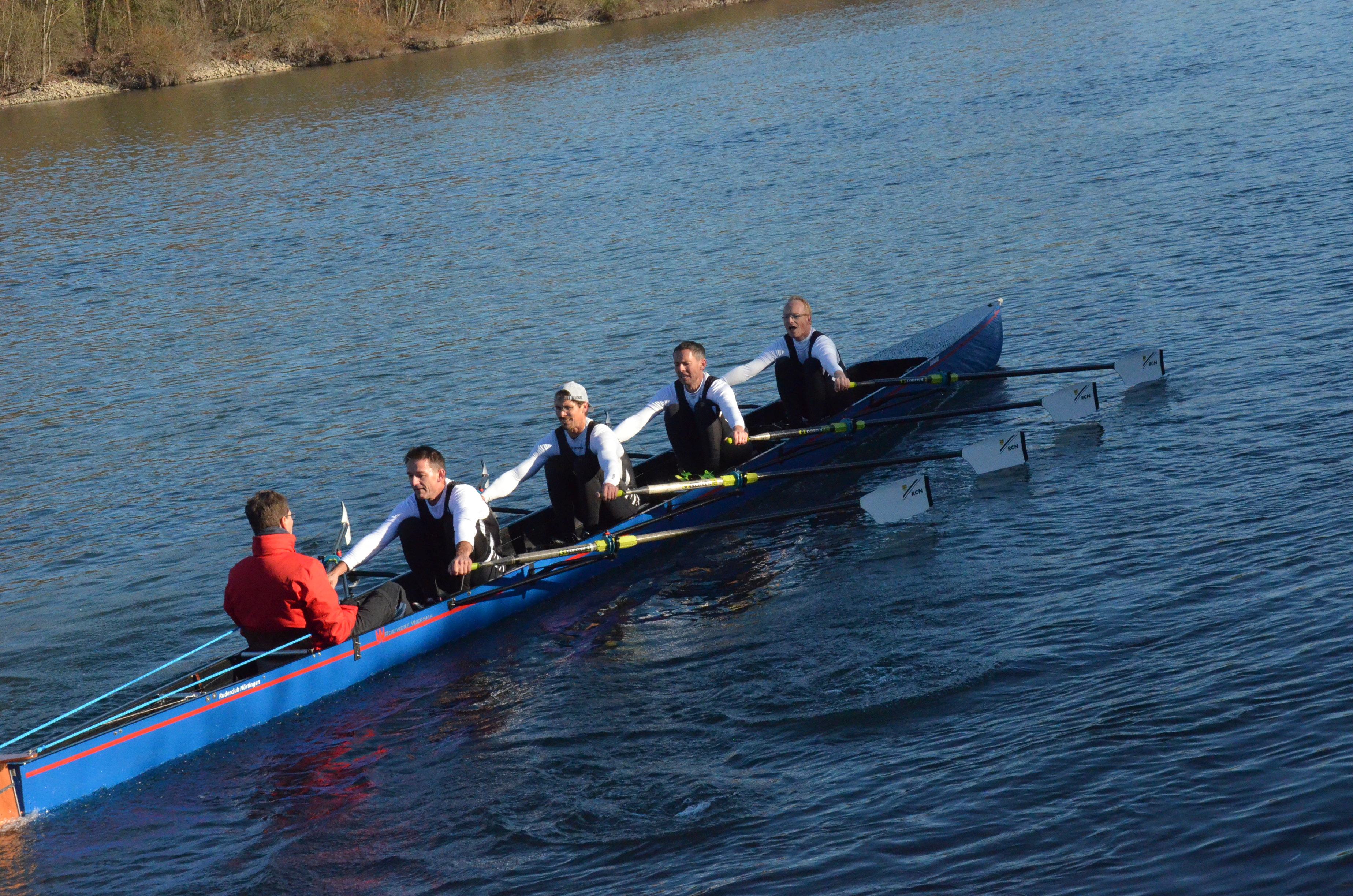 Währenddessen wurde Includer direkt vom Nürtinger „Nachwuchsteam“ übernommen, inkl. Patrick, der vom Ruder- auf den Steuersitz wechselte. Zwar hatte man sich auf die Niko-Regatta vorbereitet, aber in dieser Rennkonstellation mit „Quoten-Alemannen“ war das Ganze dann doch gleichbedeutend mit einer Jungfernfahrt. In der traditionell dünn besetzten MDA36-Klasse gab es nur einen Gegner. Diese Bad Emser Ruderer waren jedoch keine unbeschriebenen Blätter, war ihr 4x- war auf der diesjährigen Euro Masters Regatta nur knapp hinter dem Nürtinger Wettkampf-Mastis geblieben. Die vier ließen sich von der in puncto Klassensieg eher aussichtslosen Ausgangslage nicht beirren und fuhren ein gut eingeteiltes, starkes Rennen mit Schlagzahl 27 bis 28. Die knapp 30 Sekunden vor ihnen los gefahrenen Helden der Vergangenheit (MDA70 mit den Olympioniken Udo Hild und Wolfgang Glock!) scheuchten sie dabei ordentlich über die Strecke, wobei leider das Aufholen der letzten Bootslänge durch die Zieldurchfahrt jäh beendet wurde.