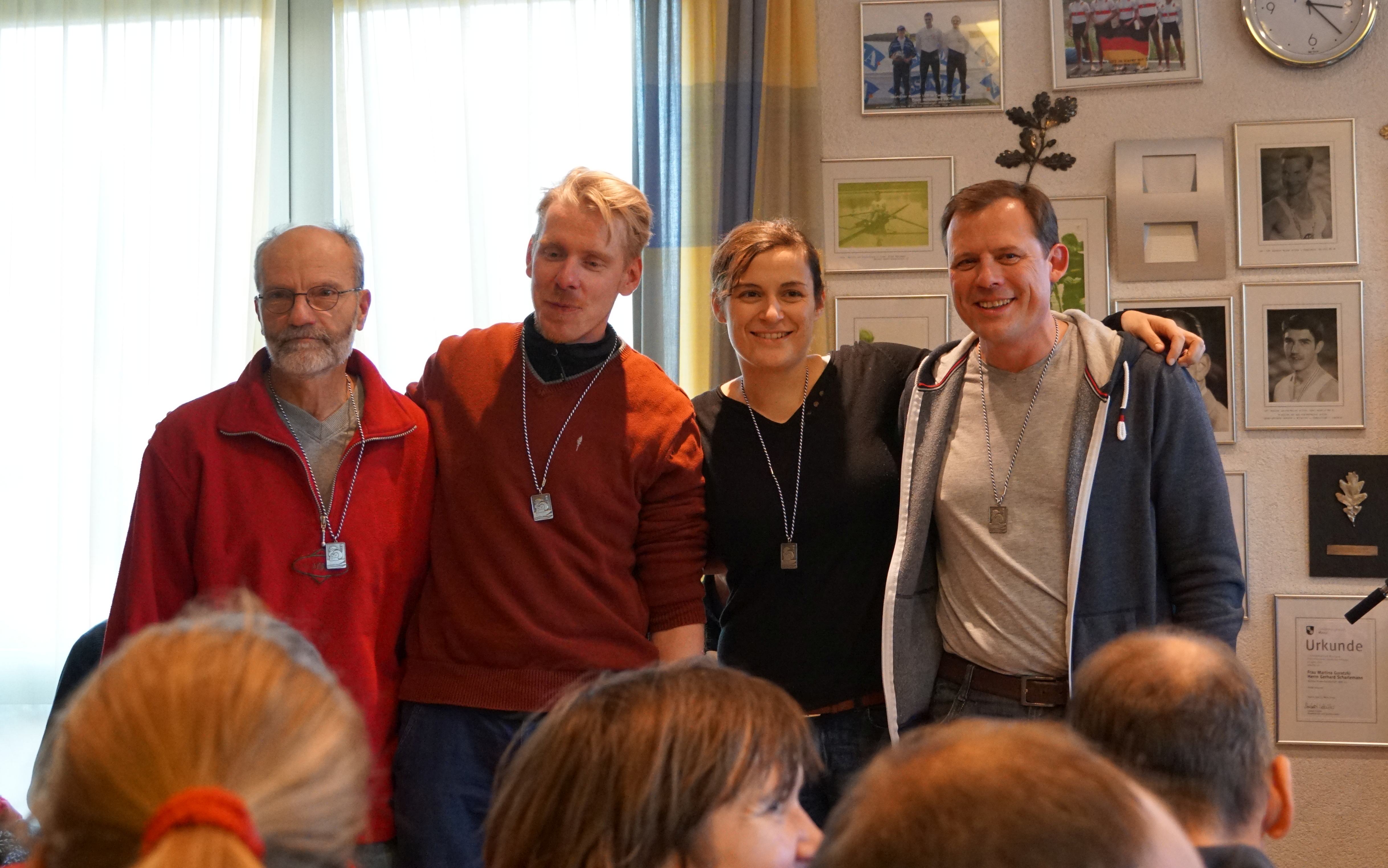 Ein sichtbar gut gelaunter Götz mit zwei seiner drei Mitruderer (Beate Fröhlich und Thomas Bartel; es fehlt Viola Wilke) und Steuermann Wolfdietrich „wd“ Jacobs (ganz links).